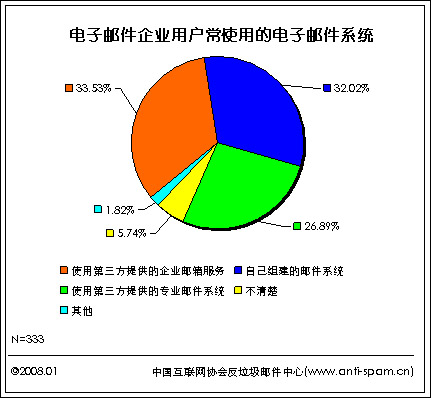据中国互联网协会反垃圾邮件中心(www.anti-spam.cn)最新发布的2007年第四季度反垃圾邮件状况调查报告中就企业用户电子邮箱的使用现状调查显示:企业用户经常使用的电子邮件系统主要有三种方式:第三方提供的企业邮箱服务、自己组建的邮件系统和第三方提供的专业邮件系统。其中使用第三方提供的企业邮箱服务的用户所占比例为33.53%,与上季度的29.31%调查数据相比增加了4.22个百分点,并由上季度的第二位跃升至本季度的第一位。