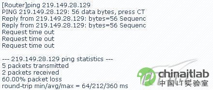 第四步:将连接员工机的二层交换机进行了更换,网线也重新制作了一根好的,故障依旧。至此笔者已经可以肯定的说,问题出在路由器上。本人将路由器上连接外网的那个网线拔下来,网络马上恢复了正常。但是只要接上连接外网的网线ping内网数值又大了起来,而且在路由器上ping外网网关依然会出现丢包现象。(如图2)