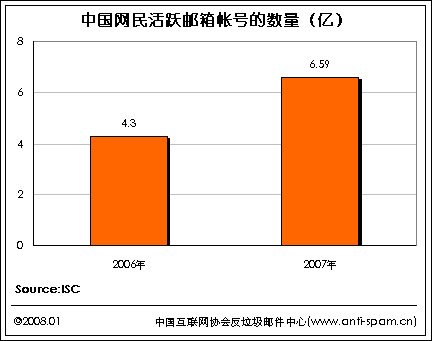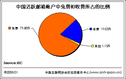 据中国互联网协会反垃圾邮件中心(www.anti-spam.cn)最新发布的2007年第四季度反垃圾邮件状况的调查报告中,针对2007年中国个人电子邮箱用户的使用现状调查发现,截至2007年12月,活跃的电子邮箱账号总量为6.59亿,与去年同期数据相比增长了53.3%。在所有的电子邮箱账号中,免费邮箱账号为5.26亿,占整体邮箱账号的79.8%;收费邮箱账号为:1.25亿,占整体邮箱账号的19.05%。同时在收费邮箱中,企业邮箱的数量为0.95亿,个人收费邮箱为0.3亿。