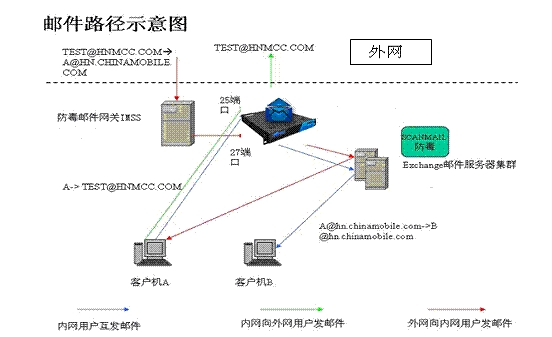 湖南移动公司的邮件系统采用Exchange 2000,共有4000个邮件用户,邮件系统安装在内网,邮件网关上部署了趋势的IMSS系统进行病毒邮件过滤。防火墙使用安氏204。用户可以使用outlook、foxmail的客户端工具在内、外网收发邮件。为了保障邮件服务器的安全,目前外网的用户不通过邮件系统WEB方式发邮件。