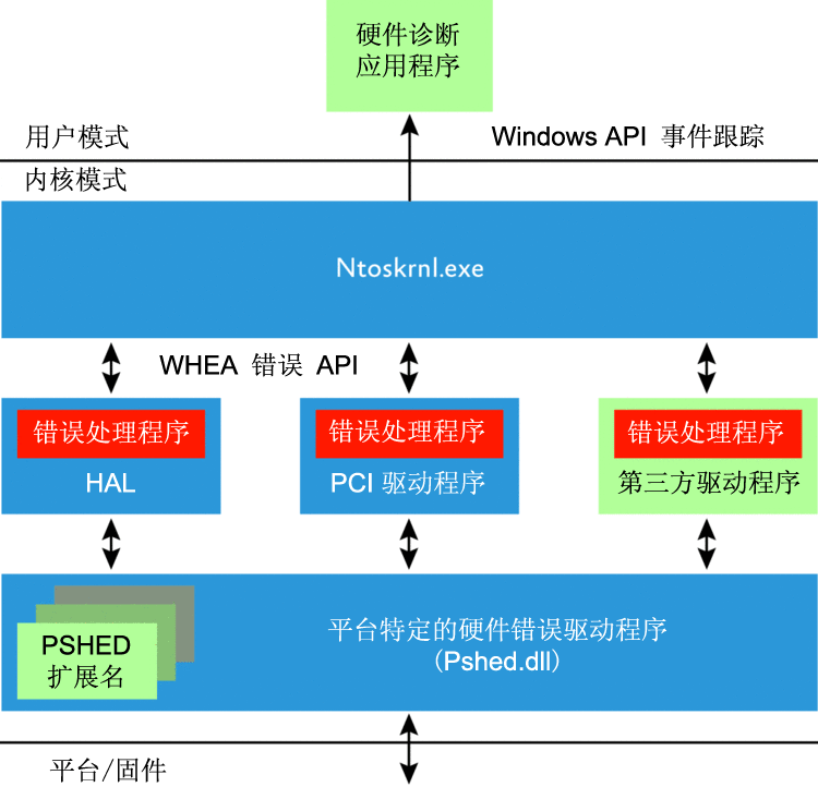 WHEA 的另一关键部分是位于 %Systemroot%\System32\Pshed.dll 中的平台特定的硬件错误驱动程序 (PSHED)。内核与 PSHED 链接,而它与平台和固件硬件连接,实质上是用作错误通知和 WHEA 错误报告 API 之间的转换层。Microsoft 为每种平台体系结构(x86、x64、Itanium)提供有一种 PSHED 并且 PSHED 公开了插件模型,所以硬件供应商和制造商可使用特定于其平台的行为来覆盖默认行为。