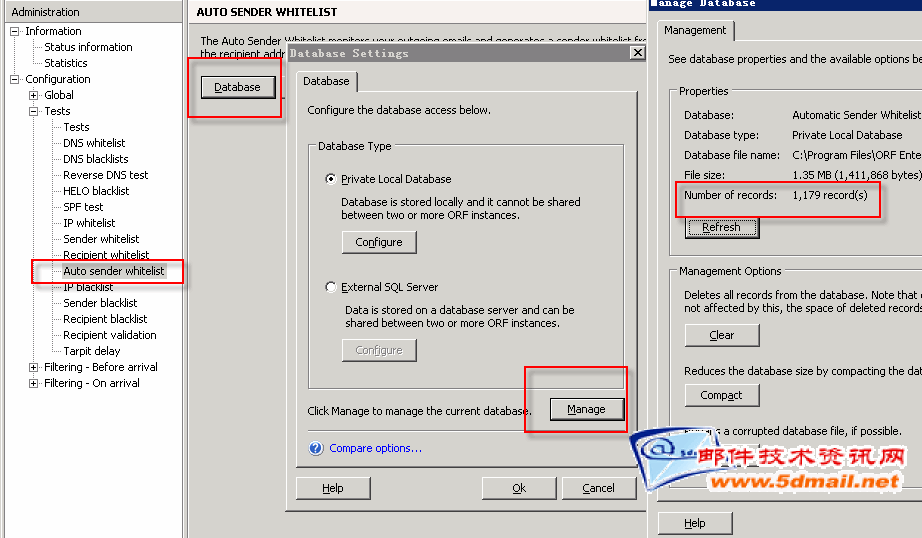 我们可以通过下面的界面,了解自动发件人白名单(Auto Sender Whitelist )记录数。如下图我们可以看到,自动发件人白名单数据库共有1179条记录。
