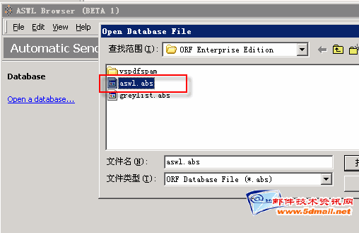 3.定位到ORF的安装目录,默认aswl.abs为自动发件人数据库,选择并打开
