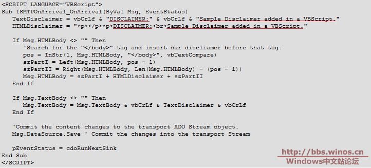 7. 根据KB317680,在C盘根目录建立EventSinkScript.vbs文件,脚本内容请根据需要自行更改,但需要注意,下图中TextDisclaimer和HTMLDisclaimer的红线字段必须一样