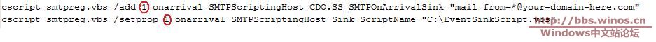 cscript smtpreg.vbs /add 2 onarrival SMTPScriptingHost CDO.SS_SMTPOnArrivalSink "mail from=*@your-domain-here.com"
