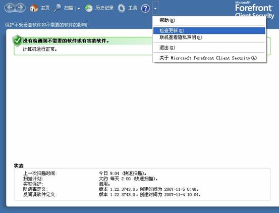 .X!y:U %w'cN6)_ 通常Forefront会自动更新,无需手动干预,但是如果你要手动更新也可以,打开Forefront主页面。然后点工具栏里问好右边的倒三角,在下拉菜单中点击 检查更新 即可。如下图: