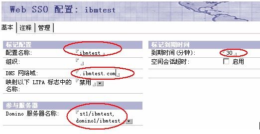 配置SSO具体内容,在“配置名称”域填写“ibmtest”;“DNS网络域”填写“.ibmtest.com”;“到期时间(分钟)”填写“30”;“Domino服务器名称”域选择“Domino1/ibmtest” 和“St1/ibmtest”。填写如图11所示,具体如下: