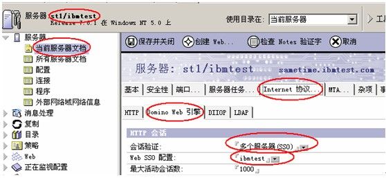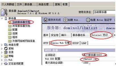 设置“多服务器(SSO)”会话验证,“当前服务器文档”->“Internet协议…”->“Domino Web 引擎”。设置“会话验证”域为“多服务器(SSO)”;设置“Web SSO配置”域为“ibmtest”,如图12所示,具体如下: