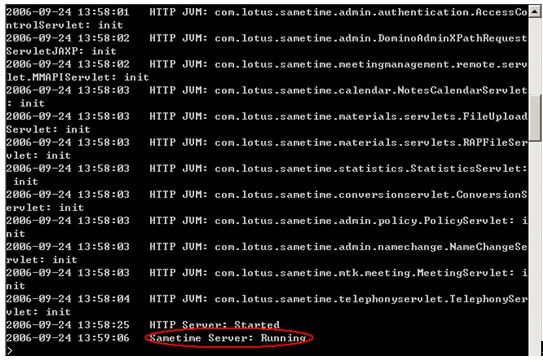 启动Domino服务器的Domino服务(主服务器),Sametime服务器的Domino服务(从服务器),在Sametime服务器的Domino服务中见到“Sametime Server:Running”,如图21所示,即表明从服务器中的Sametime已经成功启动,具体如下: