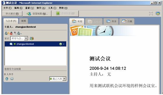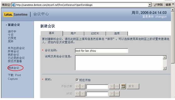 在浏览器地址栏中输入Sametime服务器相关链接,如图22所示,选择“测试会议”,具体如下:
