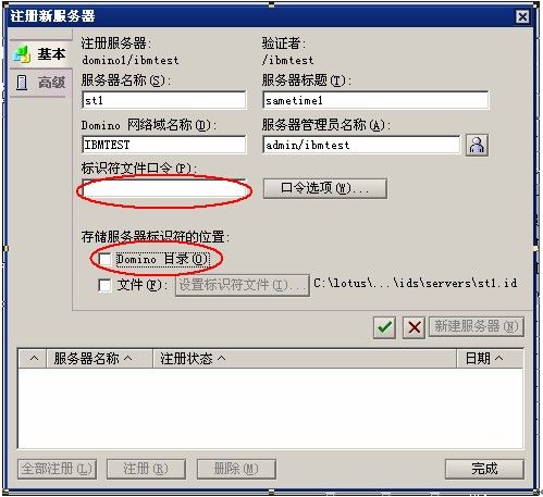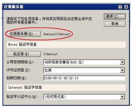 确认无误,选择“继续”,进到“注册新服务器”页面,输入相关信息,但是必须保证“标识符文件口令”值为空,去掉“Domino 目录”的选项,具体内容见图8,如下: