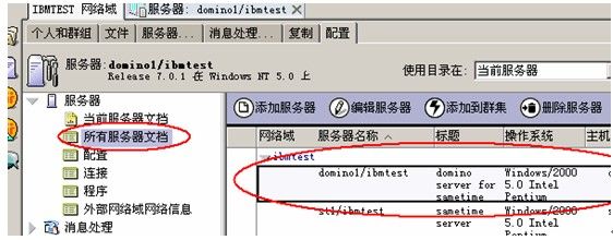在服务器“配置”->“服务器”->“所有服务器文档”中选择Domino主服务器(domino1/ibmtest)如图9,具体内容如下: