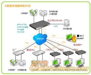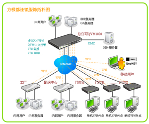 首先,在昆明总部中心端部署侠诺QVM 1000 VPN防火墙,可同时支持PPTP、IPSec VPN、SmartLink VPN、QnoKey IPSec客户端密钥等多种VPN连机方式,实现方根都总部、云南全省100余家自营店及加盟店,以及广大的移动用户建立VPN互连网络,实现实时通讯,共享总部中心端ERP、FTP等应用系统。