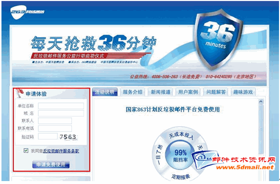 登录“263反垃圾邮件”活动页面http://tap.263.net, 在左侧的申请体验栏中输入用户的单位名称、域名、联系人、联系电话及验证码,我们的客服人员会电话跟用户联系,开通服务,并给用户发送管理员用户名和密码;