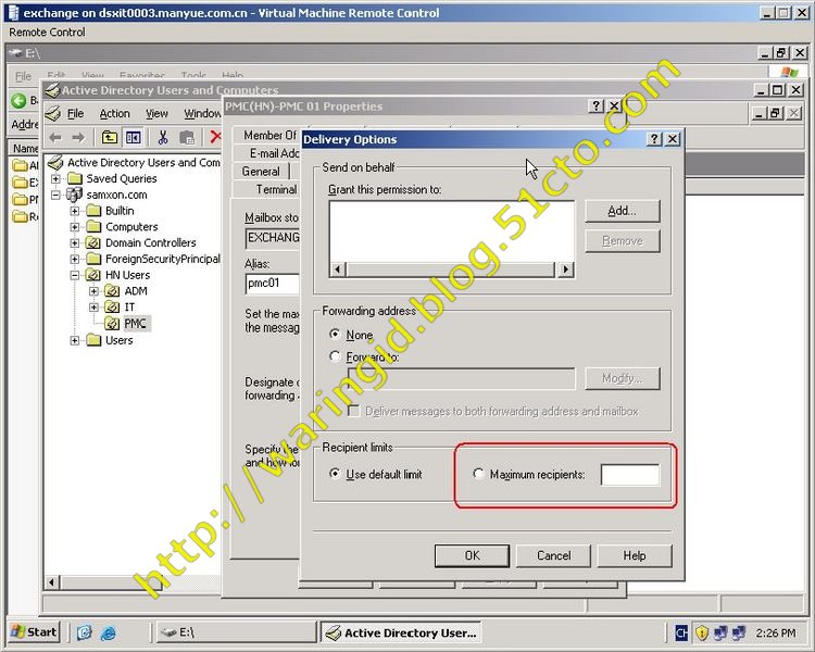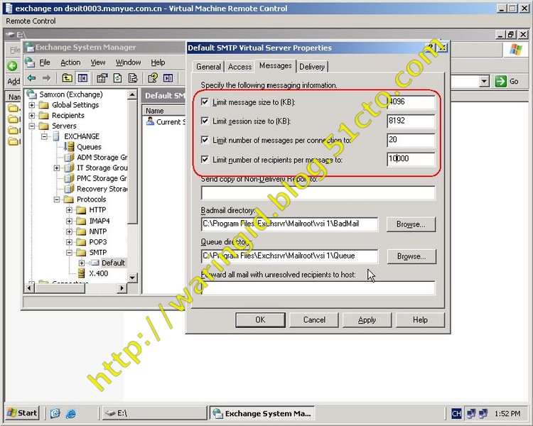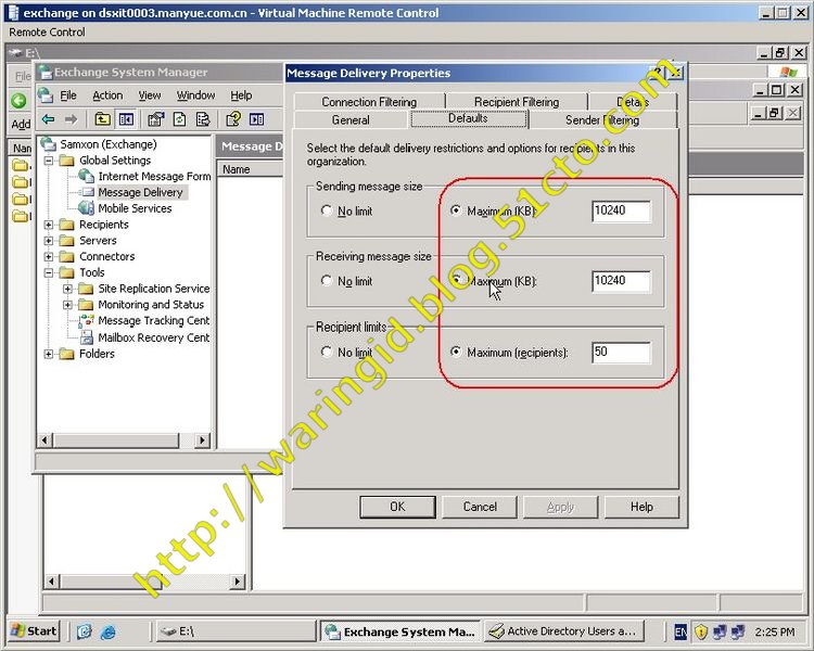 说到这里,你会发现针对邮件的大小一共有三个地方可以设定.分别是"SMTP连接器","全局设定","用户设定".经过测试发现这里的冲突的检测原则是:"用户设定">"SMTP连接器">"全局设定".如果你的全局设定中设置最大收件人为2个的话,在发邮件是如果收件人多于2个则会出现下面的提示: