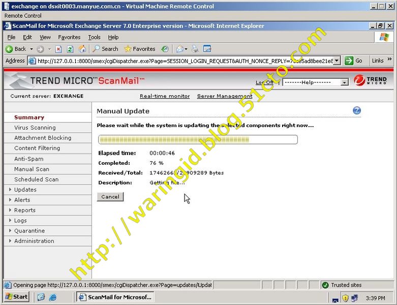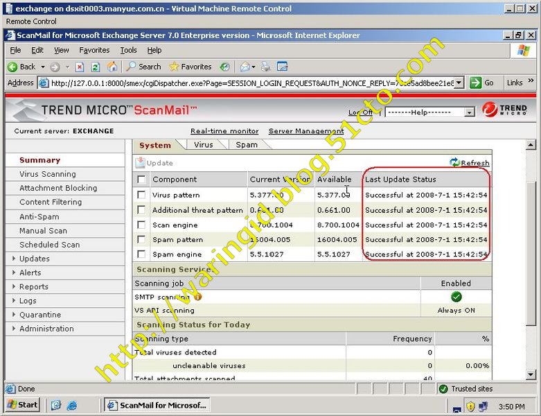 ScanMail Suite for Microsoft Exchange提供了更加有效的高性能邮件服务器安全--连续五年获得邮件服务器防病毒市场第一名。*除了拦截病毒、垃圾邮件、网络钓鱼和内容过滤之外,新版本还提供了针对间谍软件和零时差威胁的高级保护。不论您是安装Exchange Server 2000、2003或新的2007版,ScanMail均为您的Exchange提供了优化的环境。扫描效率的提高和更加紧密的集成可以减少对IT、基础设施的影响和降低管理成本--使企业获得丰厚的投资回报。相关介绍:http://cn.trendmicro.com/cn/products/enterprise/scanmail-for-microsoft-exchange/.如图:
