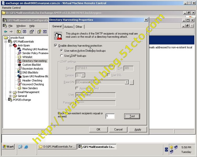 这一规则检查那些发往电子邮件服务器中,不存在的收件人的电子邮件。这通常是帐号收集攻击的一个信号,目的是发现特定服务器上的邮件地址。在我的环境中,我们收到大量的垃圾邮件,这些垃圾邮件都是发给已经离开公司的员工的。使用这一过滤规则能够帮助我们直接把这些邮件处理掉,以免我们还要在以后对它们进行处理,判断它们是否合法。可以在"general"(常规)表单中激活这一功能。使用该功能需要AD或者LDAP连接到DC。