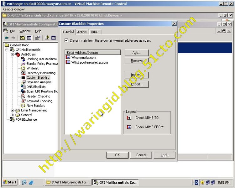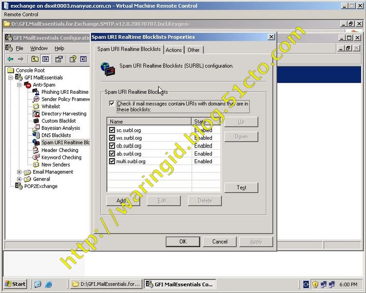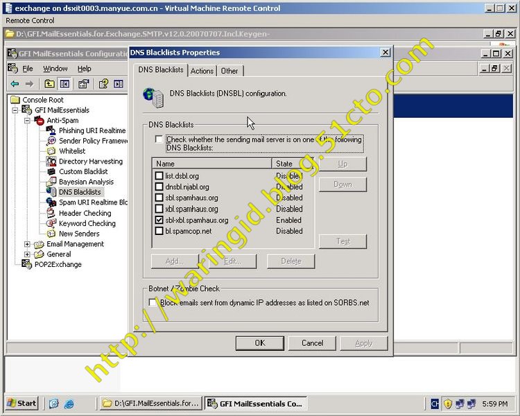 可以检查发送邮件服务器是否是那些被已知的、多个黑名单组织管理服务器。该功能需要正确配置DNS服务器。如果黑名单配置正确而DNS服务器配置有错误的话,就会出现一个暂停,电子邮件处理速度会变得非常慢。所以配置的时候要非常谨慎,可以使用测试按钮来测试连接。可以使用多个列表,但是每个列表都会延长电子邮件处理时间。