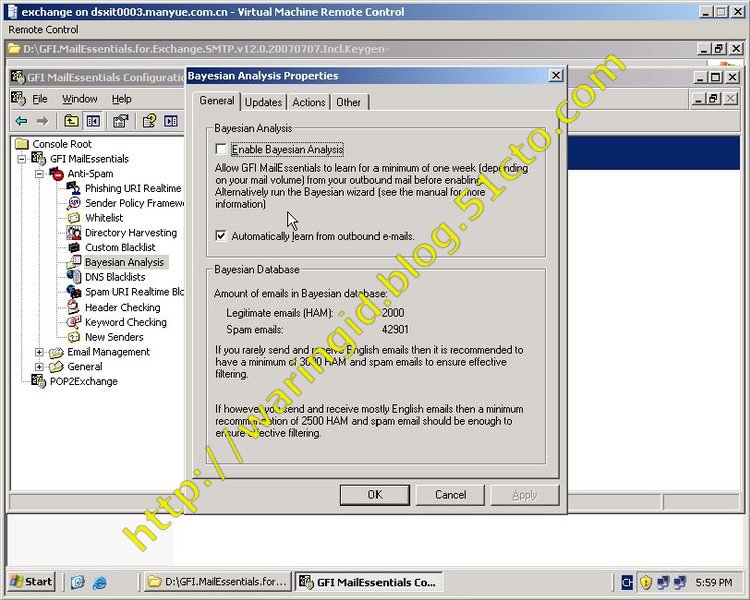 主要的垃圾邮件过滤功能。Bayesian过滤在缺省状态下是关闭的。GFI推荐至少每周要使用一次该过滤功能,起码直到有3000封邮件通过这一过滤。在这一训练期结束后,就可以正式使用该过滤功能了。
