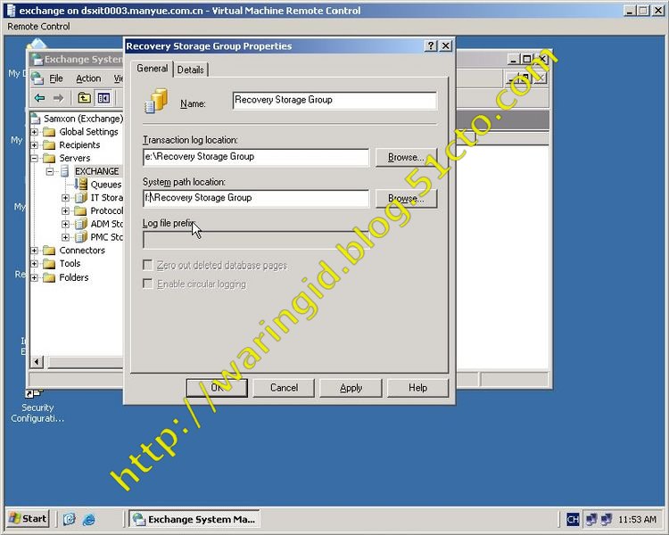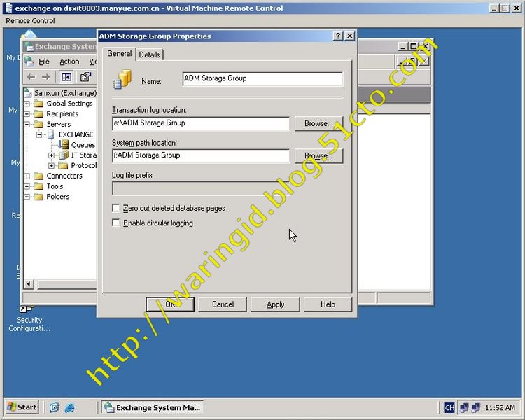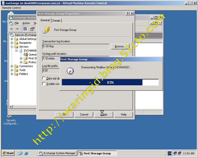 系统在建立之初会自动建立第一个存储组用来存诸相关用户的邮件及公用文件夹,但通常其名称和数据及日志的存放路径并不符合企业的管理规定.最好是按地区来命名存储组,然后在存储组下建立以各部门代码为名称的邮件存储.然后分离存储数据和日志.如图示: