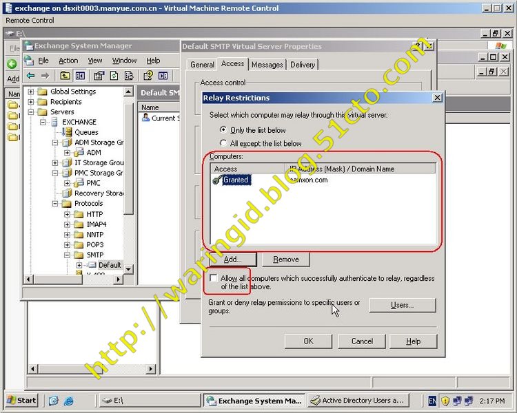 如果服务器开放了邮件中继并且未加验证的话,那么你会发现你的邮件队列中经常会存在大量未知的链接,时间久了后还可能会被列入垃圾邮件黑名单中.在Linux中很容易禁用中继,那么在Exchange中则需按下面的方法.在 Exchange 系统管理器的左窗格中的服务器中,然后展开要配置的 Exchange Server。展开协议,展开 SMTP。右键单击默认 SMTP 虚拟服务器,然后单击属性。单击访问选项卡以显示访问控制选项。单击中继按钮。在中继限制对话框中,确保允许计算机进行转发的选项被设置为 Only the list below(仅限以下列表),在其中加入自己公司邮件地址的公网域名。除非您对该虚拟服务器使用 POP3 和 IMAP4 客户端,否则请清除 Allow all computers which successfully authenticate to relay, regardless of the list above(允许所有成功通过身份验证的计算机中继,无论它是否在上面的列表中)框,然后单击确定。在 SMTP 虚拟服务器属性对话框中,单击确定。