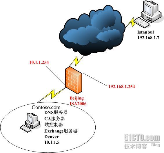 实验拓扑如下图所示,Denver是Contoso.com域中的域控制器,DNS服务器,Exchange服务器和CA服务器。Beijing是ISA2006服务器,Istanbul是外网的测试客户机。