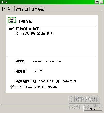 在IIS默认站点属性中切换到目录安全性标签,点击“查看证书”,如下图所示,证书是由CA服务器颁发给denver.contoso.com服务器的。