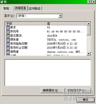 IIS申请证书之后,由于ISA准备采用桥接的方法发布Exchange站点,因此ISA服务器需要用证书向外网用户证明自己就是他们要访问的denver.contoso.com,ISA需要的证书从何而来呢?答案是从Denver上导出。下面我们就来看看如何进行证书导出,在denver的IIS管理器中打开默认站点属性,切换到目录安全性标签,点击“查看证书”,切换到证书的“详细信息”标签,如下图所示,点击“复制到文件”。
