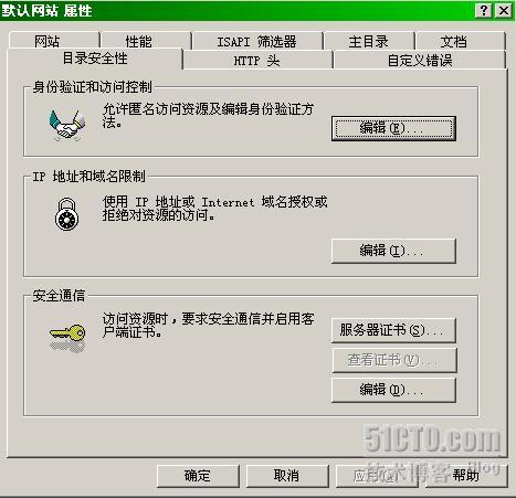 发布Exchange OWA可以使用HTTP,也可以使用HTTPS,从安全角度考虑,我们推荐使用HTTPS对数据进行加密保护。既然想用HTTPS,那肯定要在Denver的IIS上申请证书,在Denver的IIS管理器中打开默认站点属性,切换到目录安全性标签,如下图所示,点击“服务器证书”。