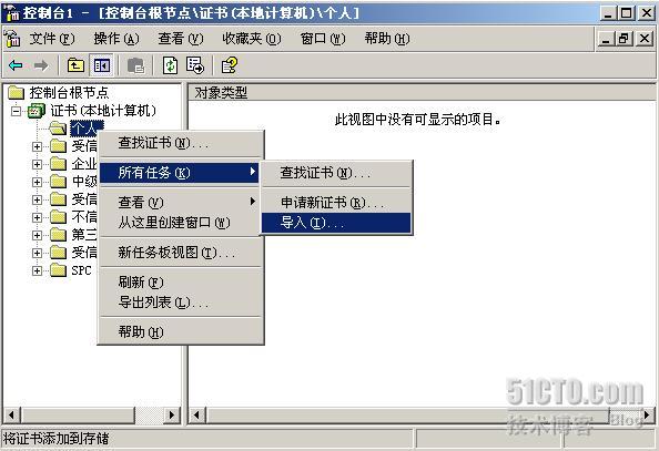 ISA服务器需要导入此前Denver导出的证书,这样才能用于Web侦听器上加密外网用户发来的数据。在ISA服务器上用MMC自定义一个证书管理工具,负责管理计算机存储的证书(具体的定义方法请参见之前博文),如下图所示,在证书管理工具中选择“导入”。