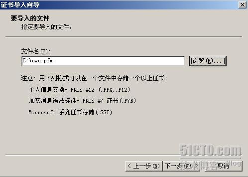 导入的owa.pfx文件就是Denver导出的证书文件。