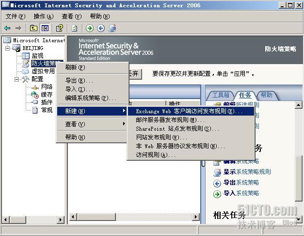 证书的申请,导出,导入等工作已经完成,接下来就可以在ISA服务器上进行Exchange的OWA发布了,如下图所示,我们在ISA服务器上选择新建“Exchange Web客户端访问发布规则”。其实ISA只有两个发布规则,Web服务器和非Web服务器,其余的都是在上述两种发布规则的基础上衍生出来的。