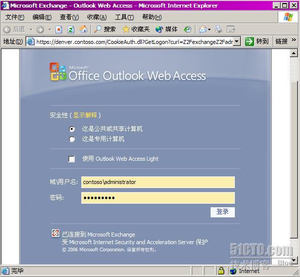 完成了OWA的发布之后,我们在外网的Istanbul上测试一下,在Istanbul的浏览器中输入https://denver.contoso.com/exchange/administrator,结果如下图所示,出现表单登录界面,选择我们使用的计算机是公用计算机上,输入用户名和密码,点击登录。