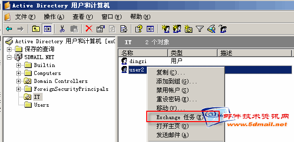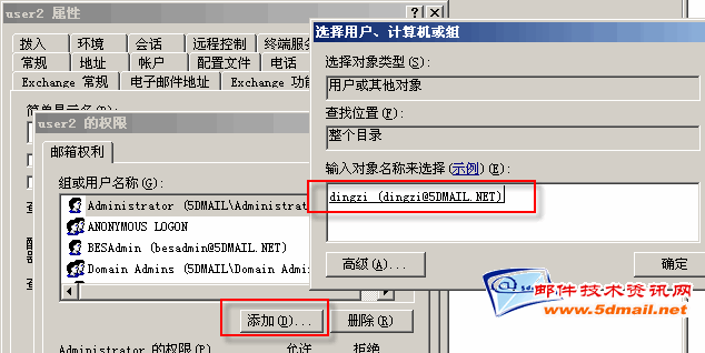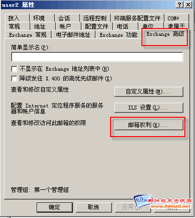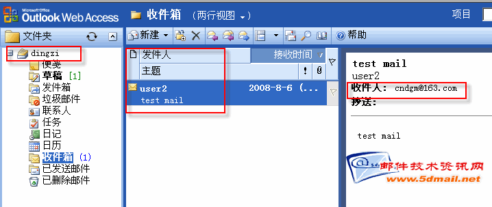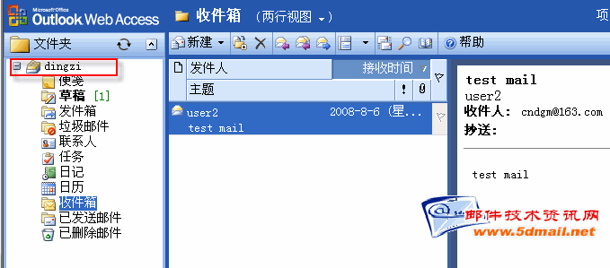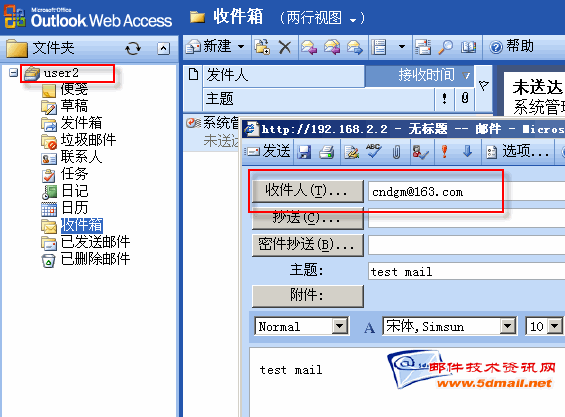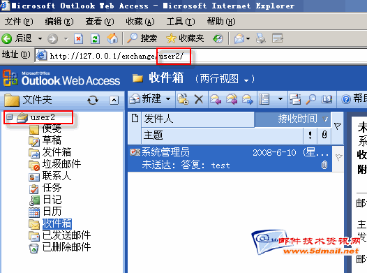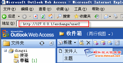B. 然后在IE地址栏直接输入需要查看的他人邮箱的地址(如http://mail.5dmail.net/exchange/user2/),如图: