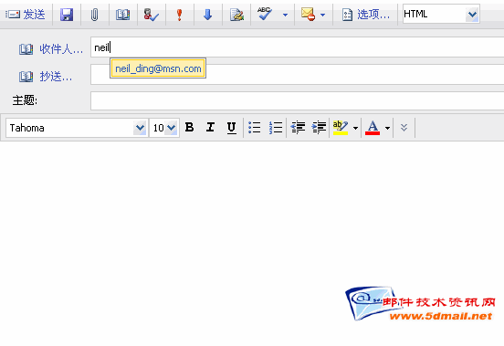 其实从自动完成列表中删除其中的项目的方法和Outlook所使用的方法一样,首先在收件人字段输入需要删除项目的前面部分以调出自动完成列表,然后移动键使用键盘的上下方向键选择需要删除的项目,如下图: