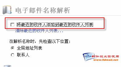 登录OWA后,请打开“选项”,找到“邮件”选项页的“电子邮件名称解析”,你将看到下面“清除最近收件人列表”的选项(如下图),单击它即可清除自动完成的列表。