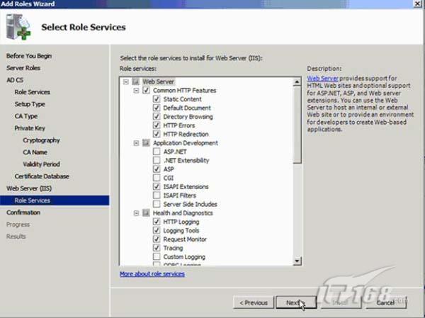 因为IIS是一个依赖的服务,因此在该演示中也需要安装,我们也需要配置它。我们不需要配置任何特殊的选项在IIS的安装中,如图11所示,因此我们能够使用缺省的设置进行到最后的页面。