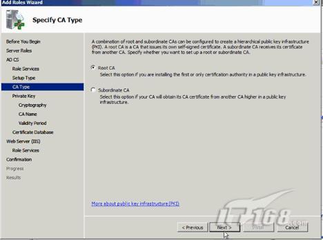 Windows Server 2008包含添加角色向导。添加角色向导不仅可以用来安装角色,它也包含角色的配置。为了让角色正常工作而必须被执行的关键配置任务是向导的一部分。展现在添加角色向导中的所有的配置在缺省情况下是安全的,对IT专家来说有默认的智能优化。我们第一步是要打开服务器管理器。服务器管理器显示所有不同的角色从细节方面。目前,活动目录域服务和DNS服务器角色被配置。我们今天要添加的是证书服务。首先我们需要添加IIS角色。