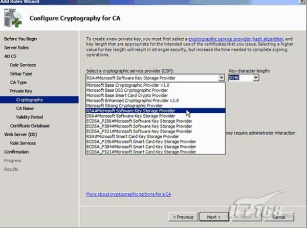 对于加密服务提供者(CSP)和哈希算法来说有很多选项可以进行选择。缺省的选项被设置为RSA Microsoft Software Key Storage Provider和2048位加密的SHA1 算法。如图7所示。